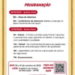 O evento reunirá representantes dos Fóruns de Educação Infantil de todos os estados, secretarias de educação, pesquisadores, professores, gestores e a sociedade civil organizada, em torno de debates atuais e provocativos sobre os desafios e perspectivas da Educação Infantil diante das políticas públicas nacionais.
