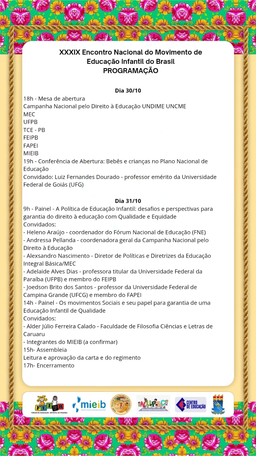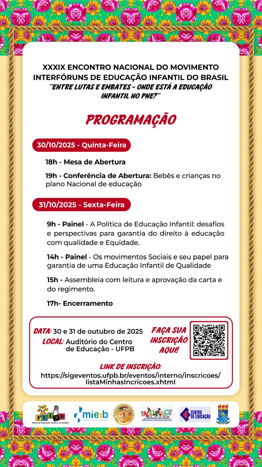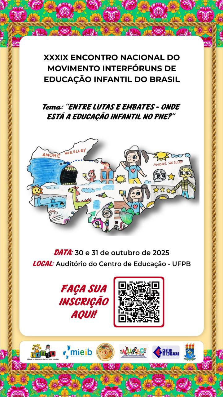 O Fórum Permanente de Educação Infantil do Estado do Rio de Janeiro (FPEI-RJ) compartilha o convite do Movimento Interfóruns de Educação Infantil do Brasil (MIEIB) para o seu XXXIX Encontro Nacional, um espaço de encontro, reflexão e mobilização coletiva.